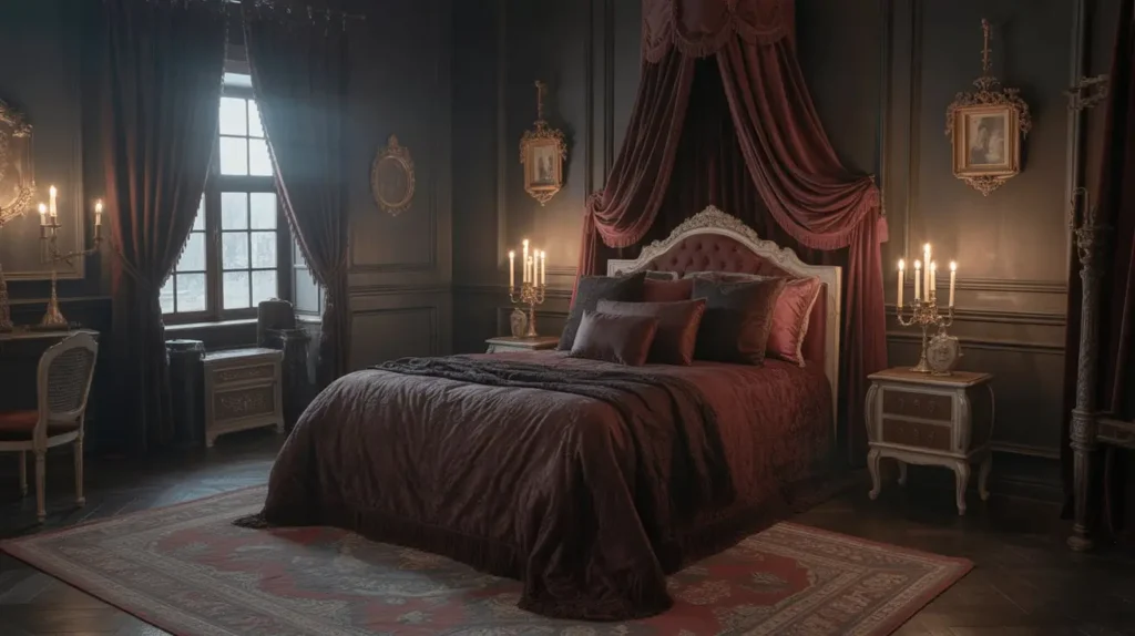 Texture matters enormously here. Combine hard surfaces like metal and wood with soft textiles like velvet, silk, and lace. A black velvet duvet with burgundy satin pillowcases and a lace throw creates that layered, romantic depth.