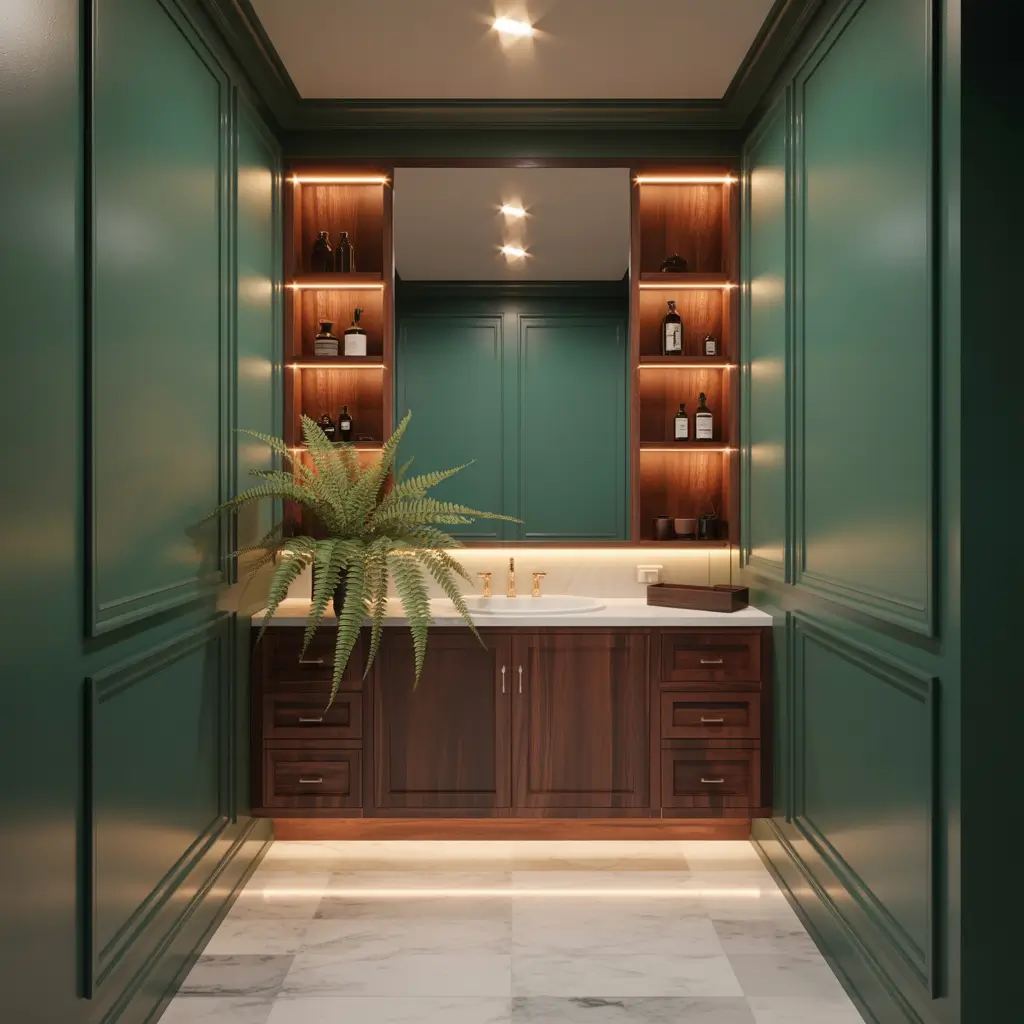 I transformed my 5×7 powder room with deep green walls, and instead of feeling cramped, it feels like a sophisticated little retreat. The trick is using the right finish, adequate lighting, and strategic reflective surfaces.