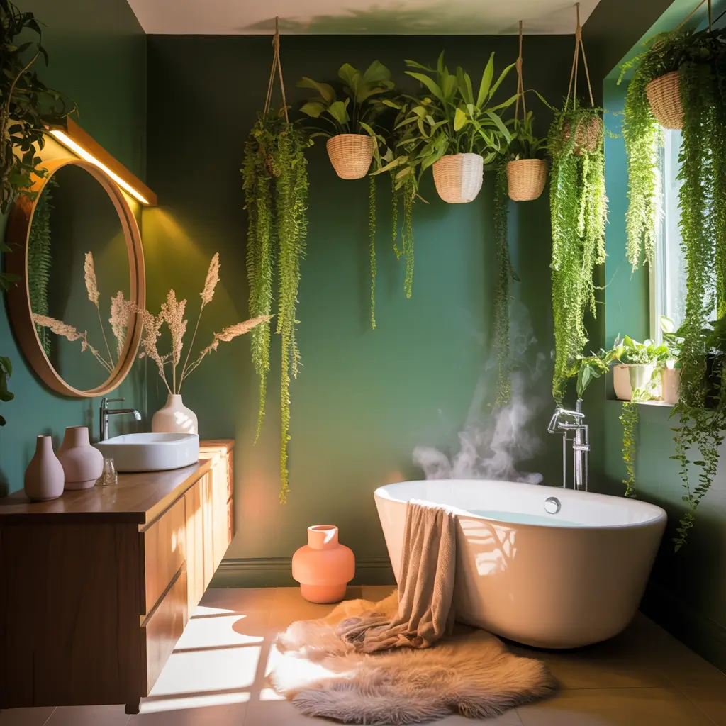 I’ve packed my bathroom with plants (the ones that actually survive humidity, anyway), and showering surrounded by greenery is genuinely therapeutic. The deep green walls create the perfect backdrop for lighter green foliage to pop against.