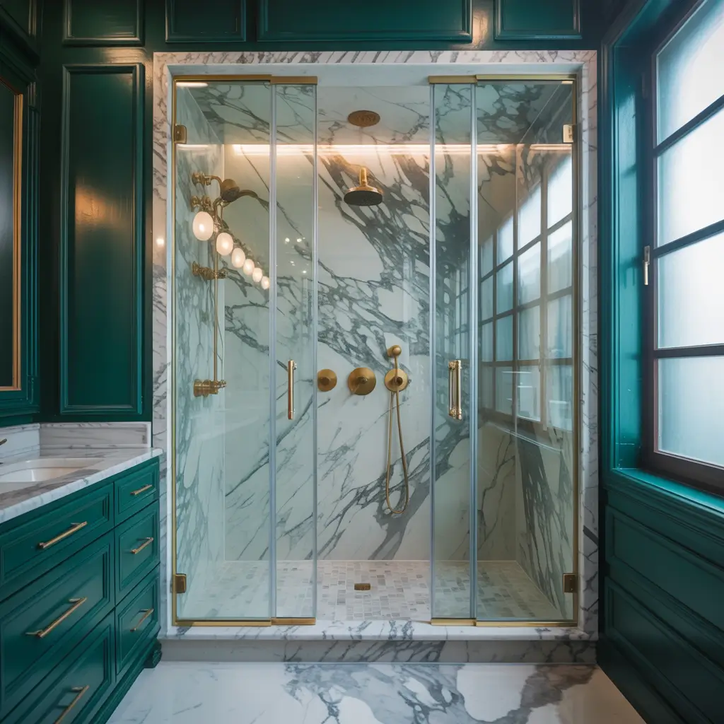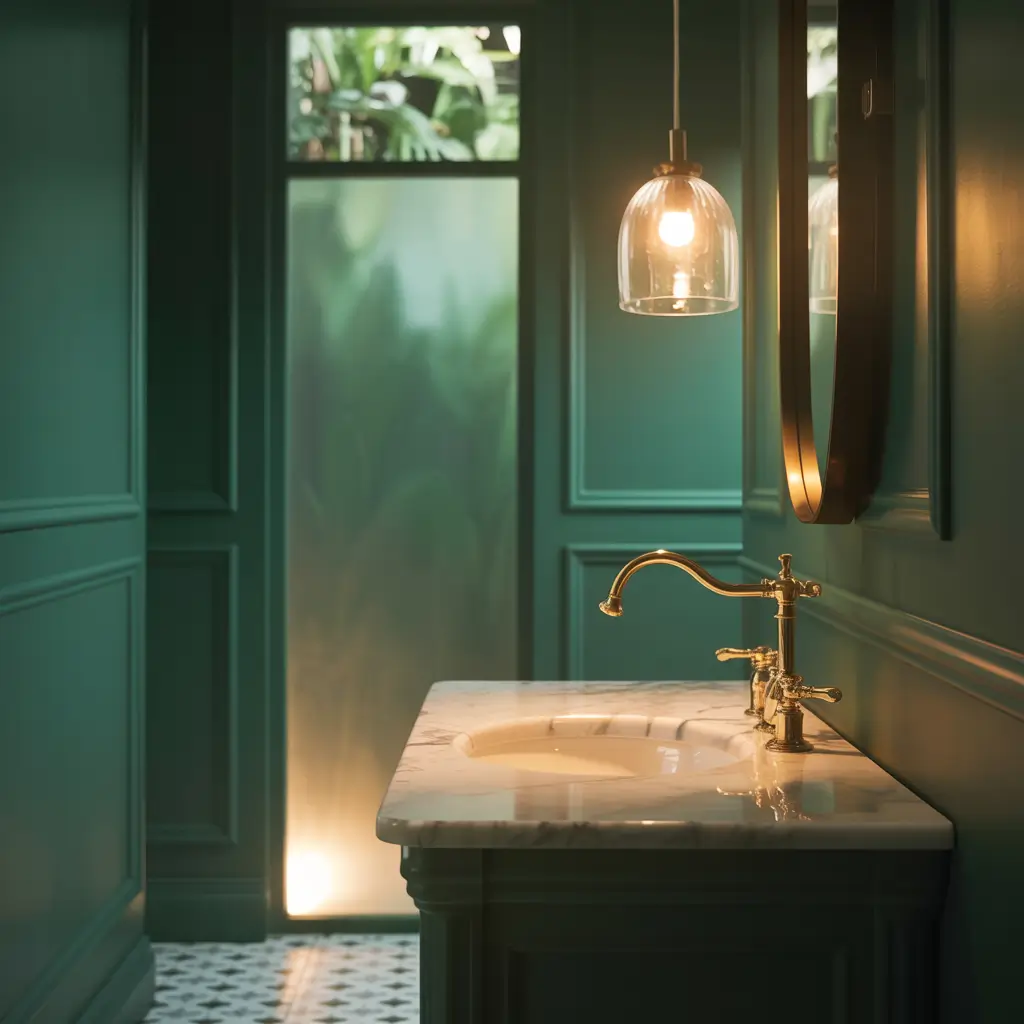 I personally love using white or cream-veined marble against deep green because it creates visual breathing room. The marble catches the light while the deep green grounds everything, preventing that sterile, too-clean laboratory feeling some bathrooms give off.