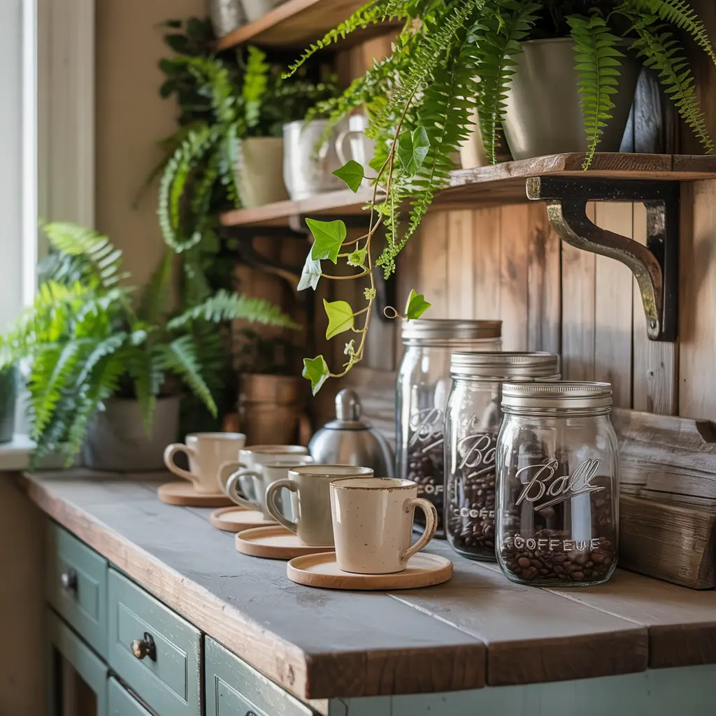 Add some brass or copper accents through your coffee accessories, display your mugs on vintage hooks, and don’t stress about everything matching perfectly. The collected-over-time look is what you’re after. This setup should feel personal, lived-in, and like a reflection of your travels and treasures.