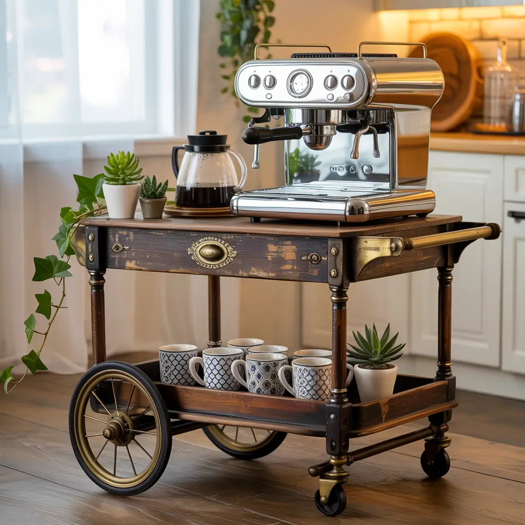 Hunt for a vintage rolling cart at thrift stores or estate sales. Brass, gold-toned, or even a retro two-tier chrome cart works beautifully. The wheels are a game-changer because you can move this whole setup wherever you need it—next to your reading chair, out on the patio, wherever the coffee cravings strike.