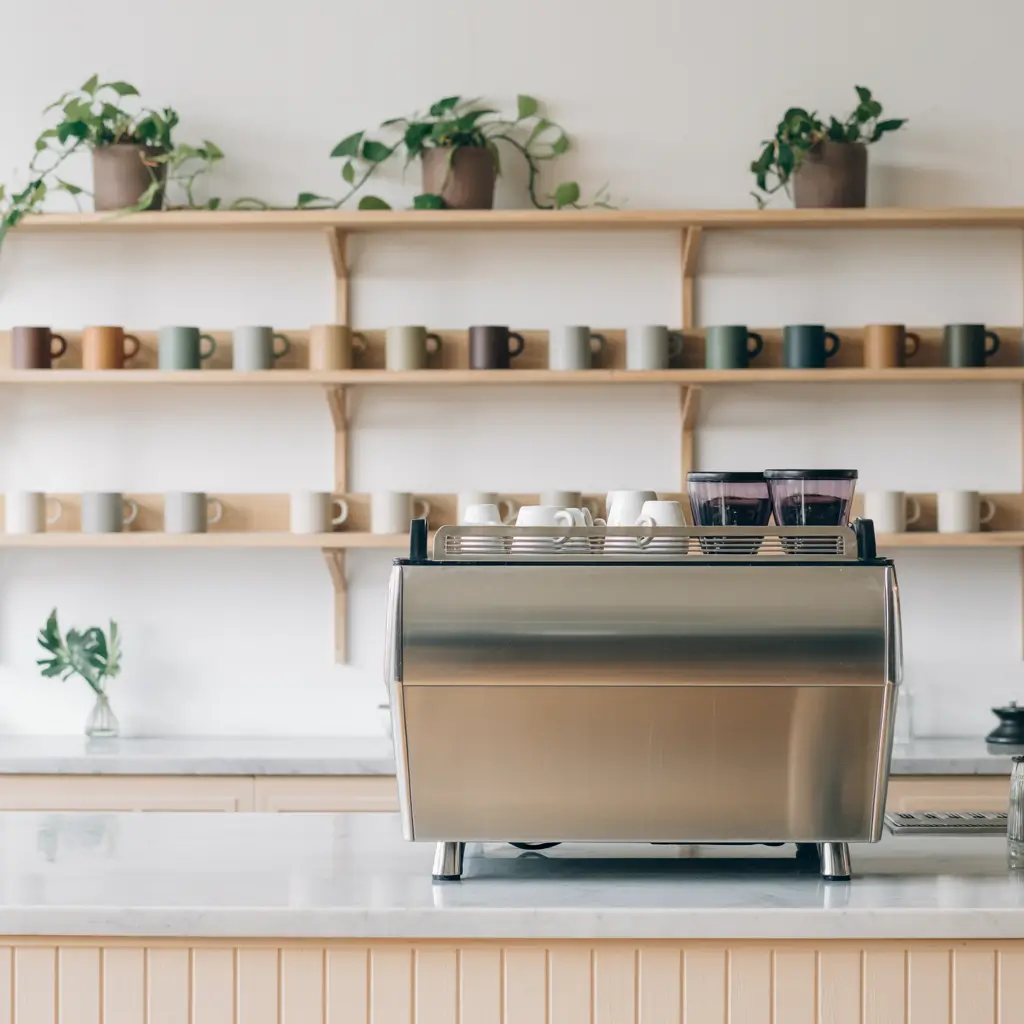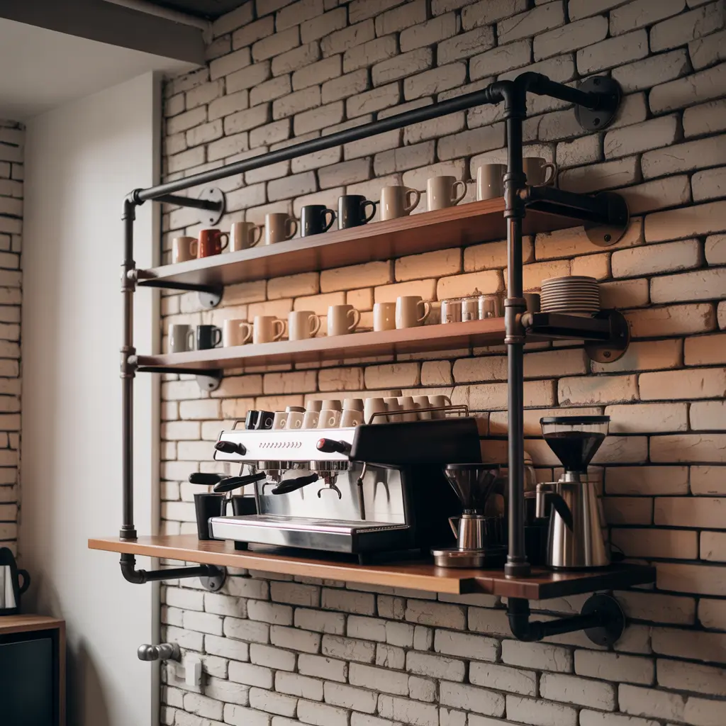 Bottom shelf: your coffee maker and daily mugs. Middle shelves: storage containers, syrups, backup supplies. Top shelf: decorative stuff like plants, artwork, or your fancy mug collection you never actually use but looks pretty.