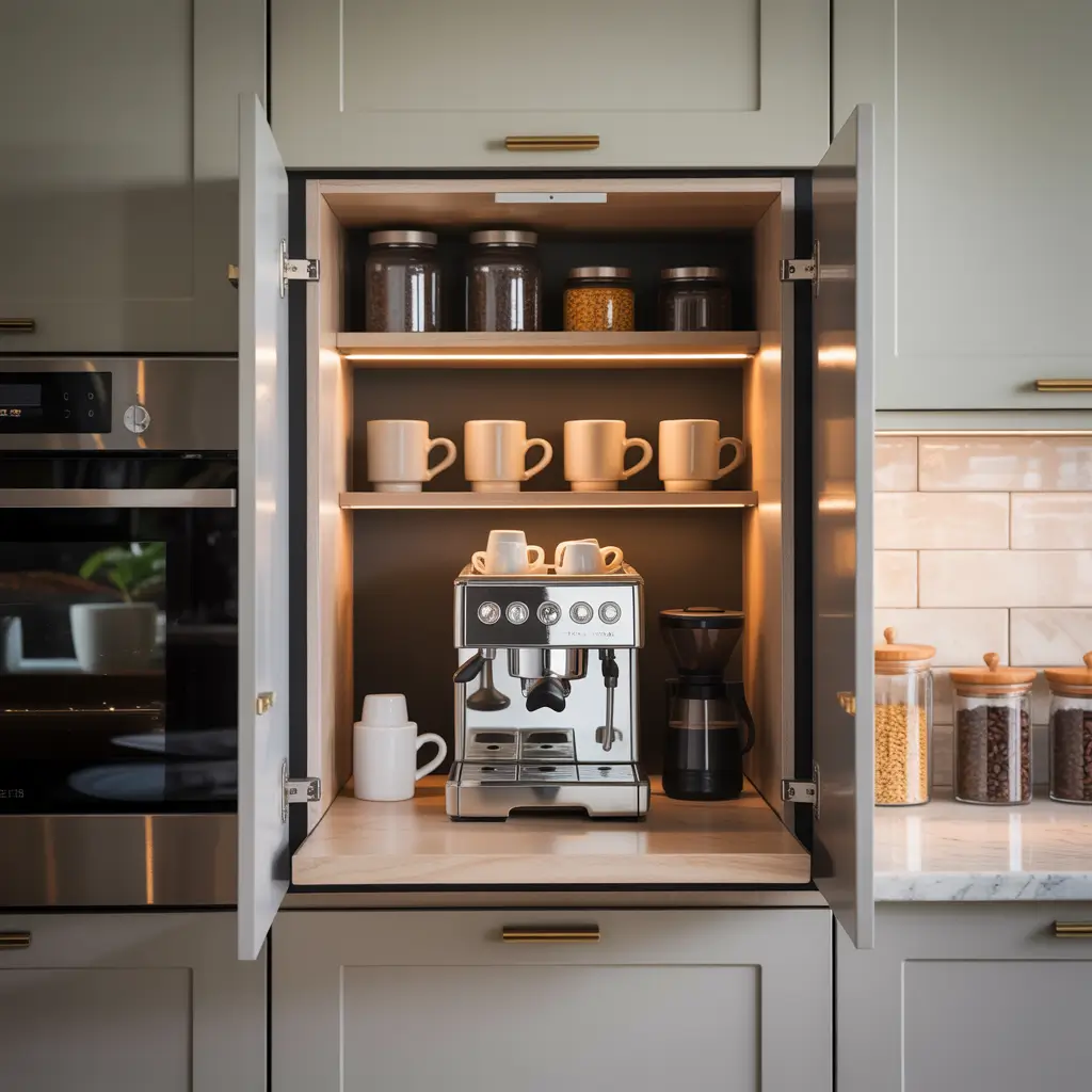 This setup is perfect for small apartments or anyone who doesn’t want kitchen appliances on display 24/7. Plus, there’s something satisfying about opening those doors to reveal your personal coffee paradise. It’s like a surprise every morning 🙂