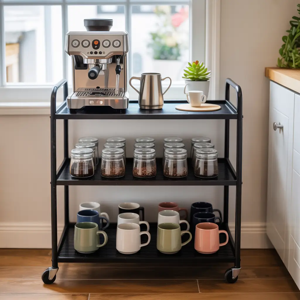 Style it to match your existing décor—modern metal for industrial or minimalist spaces, wood for farmhouse or Scandi vibes. The portability means you can have your coffee setup in the kitchen for brewing but wheel it into your home office or living room when you need a refill. Genius, right?