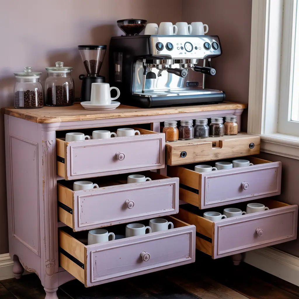 Here’s where things get creative. An old dresser you’re not using anymore? That’s your next coffee bar, friend.