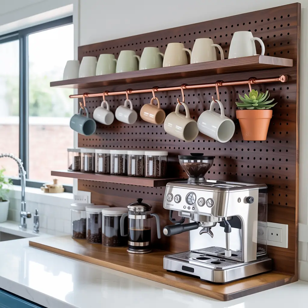 Paint a large pegboard in a color that complements your kitchen or coffee nook—black, white, sage green, whatever makes you happy. Mount it securely to your wall, then use pegboard hooks and accessories to create a completely customizable coffee station.