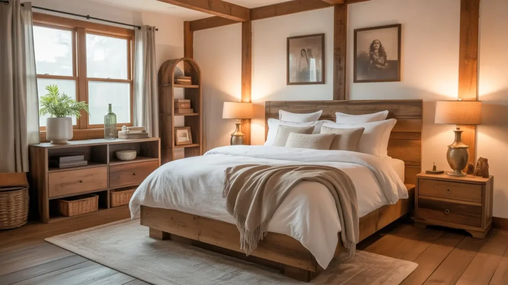 Here’s what I learned the hard way: not all wood finishes work together. I once mixed a super orange pine with cool-toned walnut, and it looked like my furniture was having an identity crisis. Stick to similar undertones—either warm or cool—and your rustic bedroom will look cohesive instead of confused.