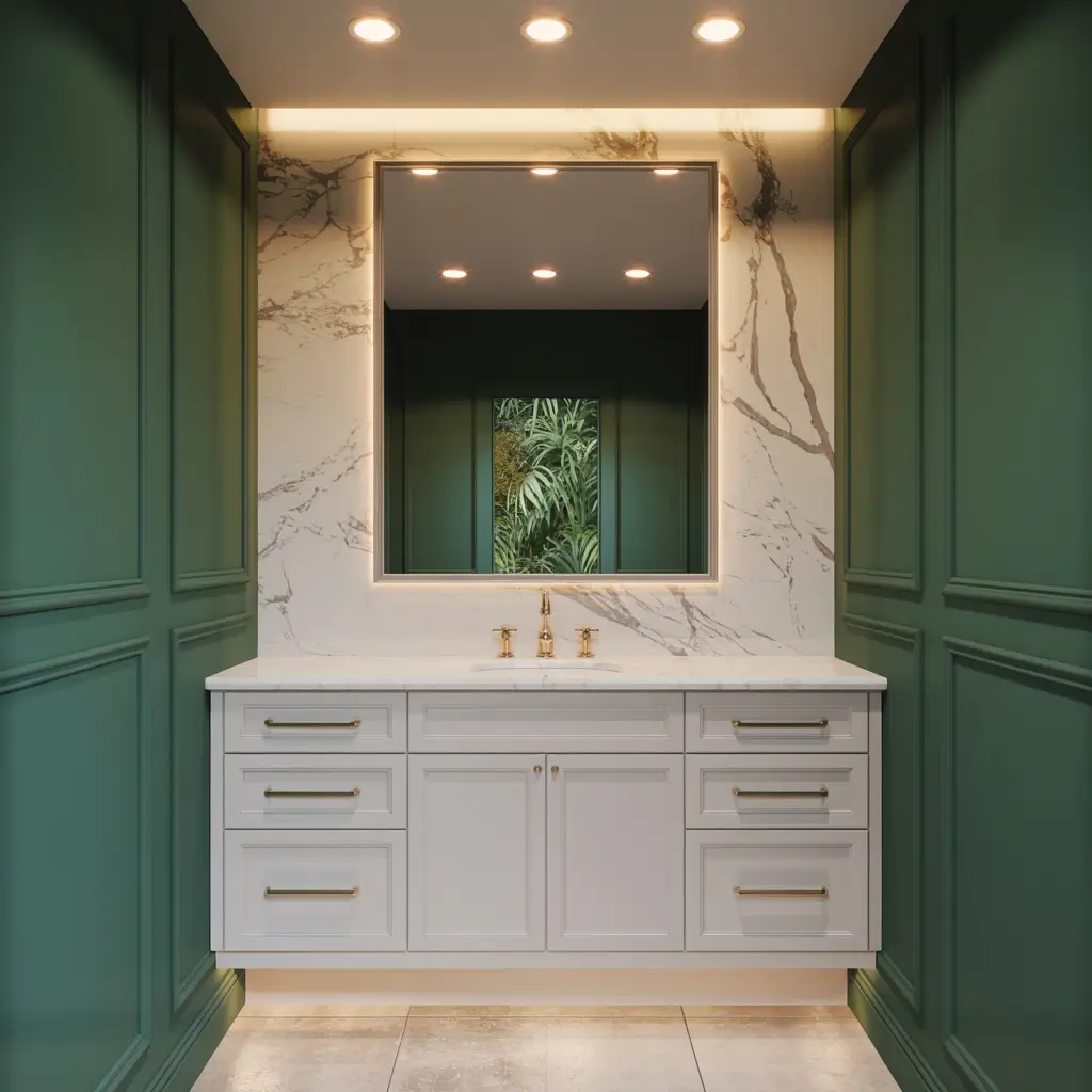 • Forest green vanity or accent wall as your focal point