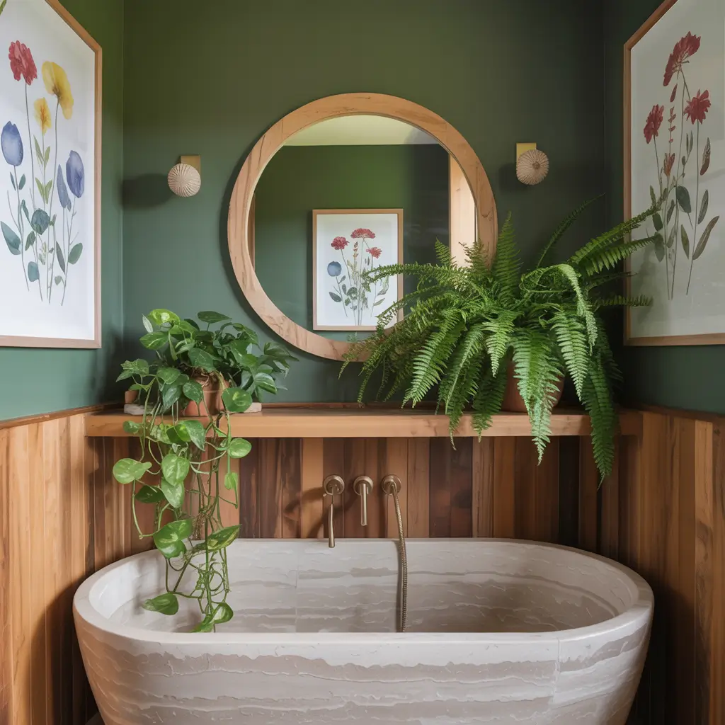 This concept combines forest green with botanical prints, tropical wallpaper, and actual plants if you’re feeling brave. The result feels like bathing in a lush garden, minus the bugs and dirt.