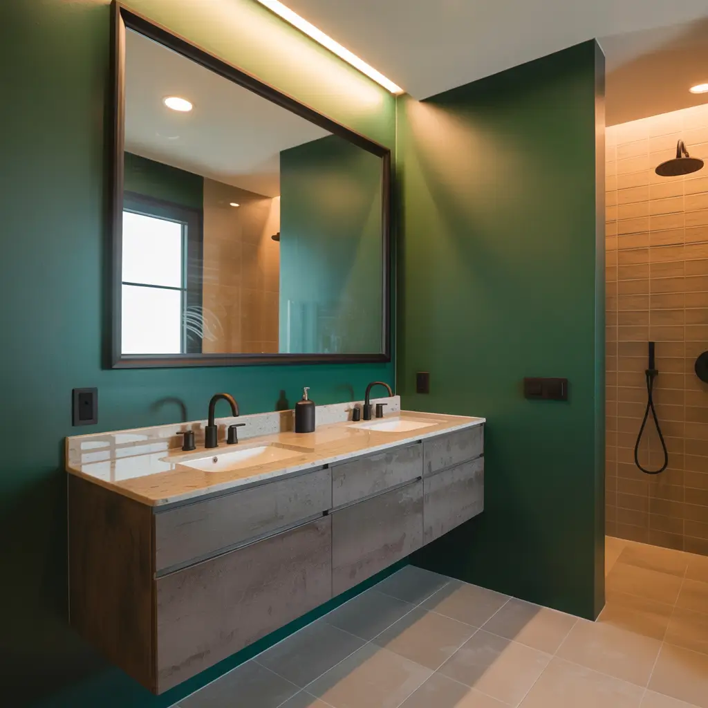 The key to modern minimalism is restraint. Choose forest green for one or two elements—never everything. Maybe it’s just your vanity. Or perhaps it’s a single accent wall with everything else in white or concrete gray.