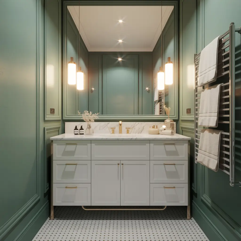 Don’t shy away from deep forest green just because your bathroom is small. This is old design advice that needs to retire. Dark colors can actually make small spaces feel more intentional and luxurious rather than cramped. The trick is balancing the darkness with adequate lighting and reflective surfaces.