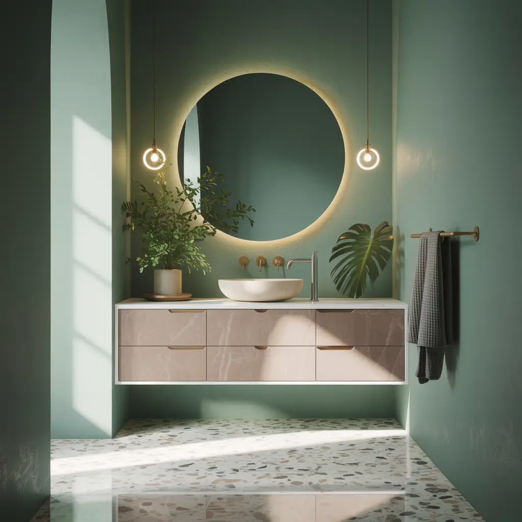 Terrazzo—that speckled flooring made of marble, quartz, or granite chips set in concrete—adds playful texture and pattern without being overwhelming. Forest green walls or vanities above terrazzo flooring create a vintage-meets-modern vibe that’s totally Instagram-worthy.