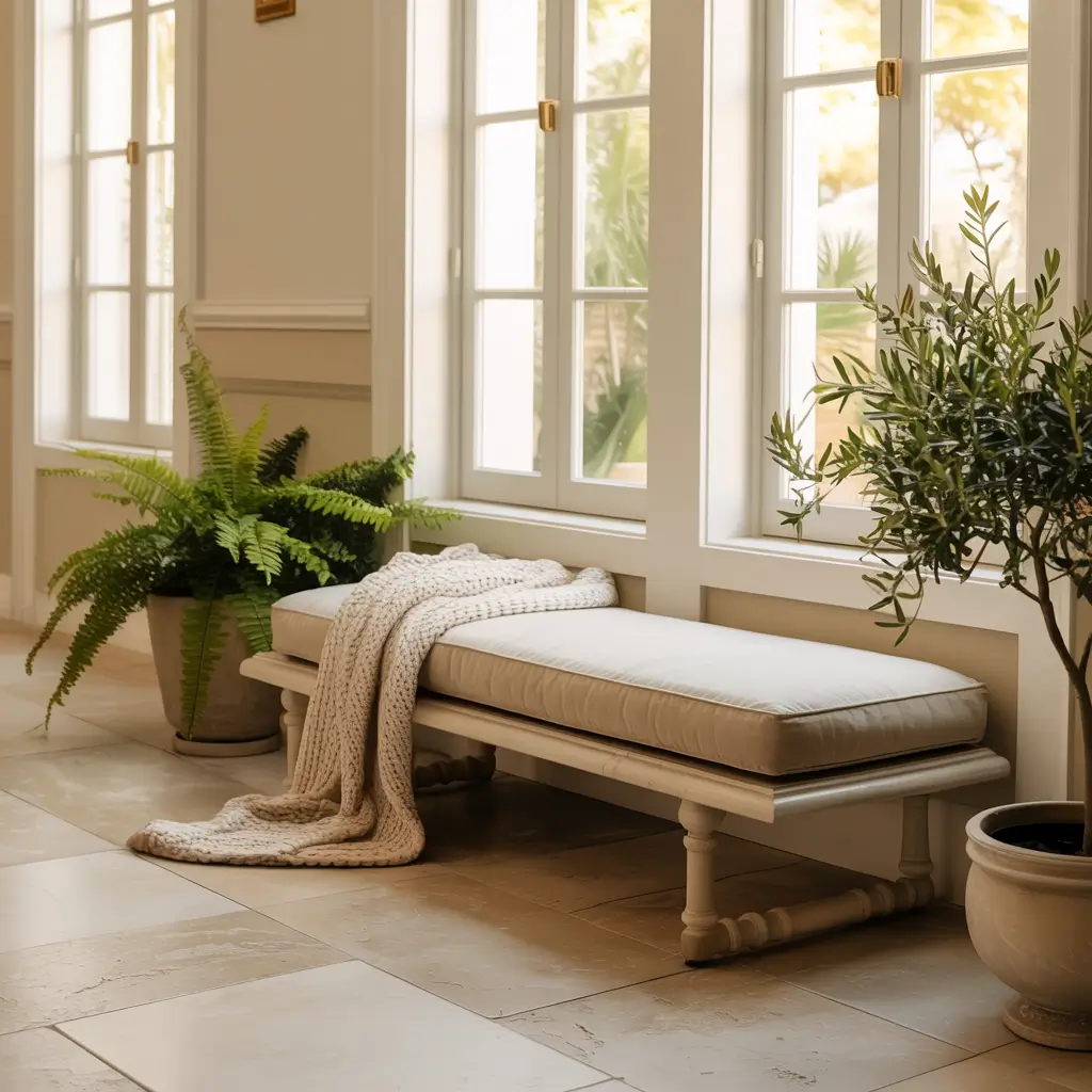 Here’s a decor hack that elevates travertine-style tiles: pair them with iron accents and warm wood tones. A wrought iron coat rack, wooden console table with iron details, and some terracotta planters create an inviting atmosphere that feels like a European villa.
