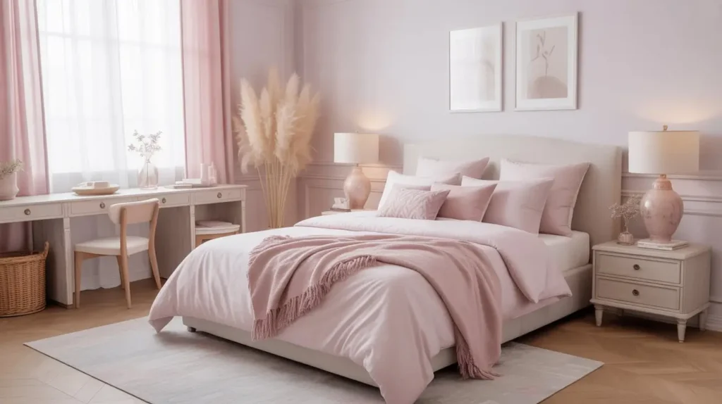 The soft pastel French bedroom is all about those delicate, dreamy colors that make you feel like you’re floating on a cloud. I’m talking pale pinks, mint greens, powder blues, and the softest lilacs you can imagine. This style proves that pastels aren’t just for nurseries—when you use them with intention and sophistication, they create the most serene atmosphere.