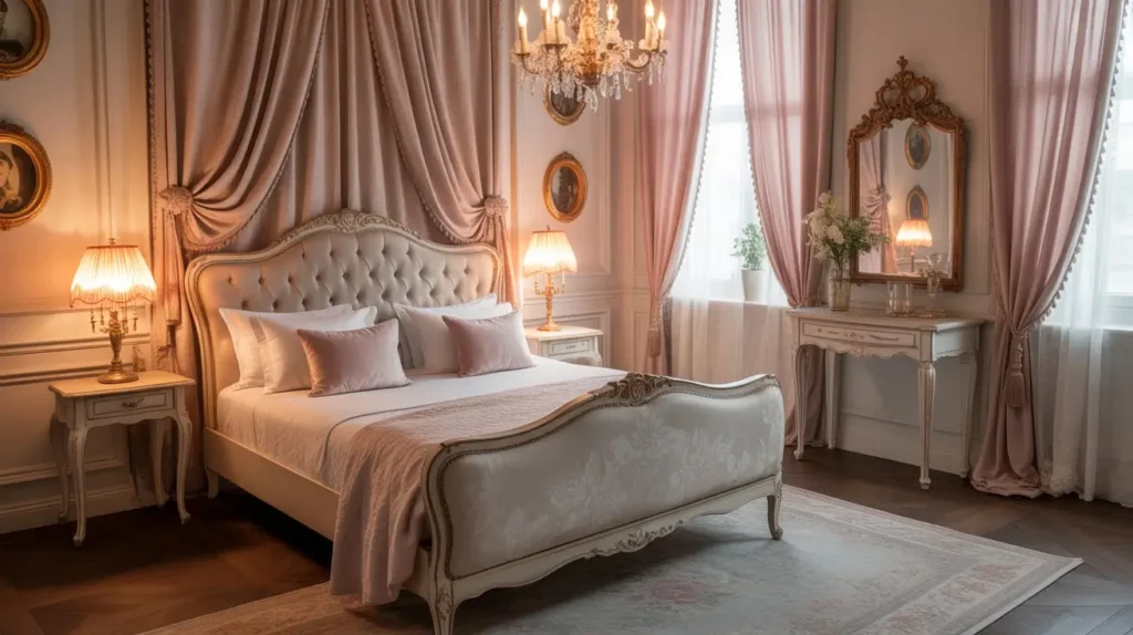 The color palette leans romantic: dusty roses, champagne gold, ivory, and soft lavenders work beautifully. Hunt for vintage or vintage-inspired furniture pieces with cabriole legs, carved details, and maybe some gilding. Your bed should feel like the centerpiece—an upholstered headboard or a wrought-iron frame both work gorgeously here.