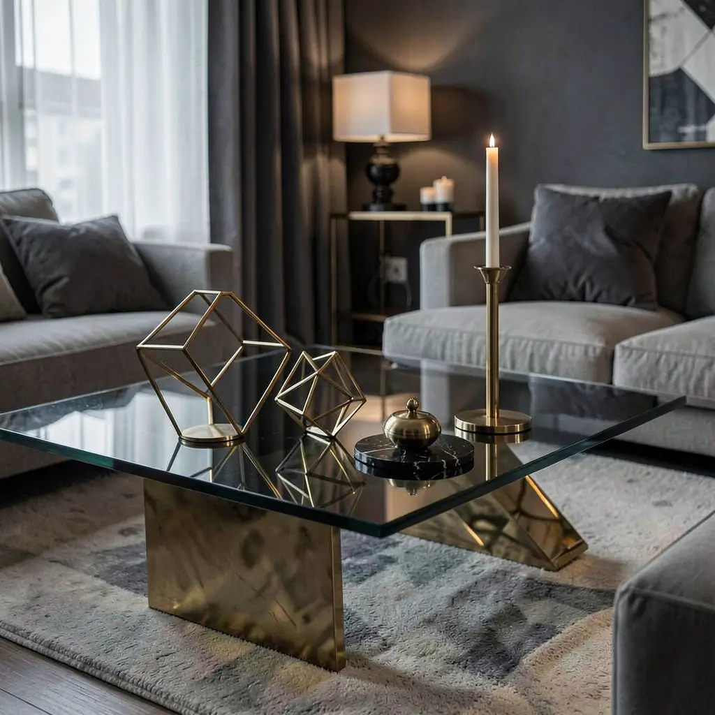 Metallics on glass coffee tables create double the drama through reflections. That single gold tray? It looks like two. Those brass candlesticks? They cast golden shadows that dance across the surface.