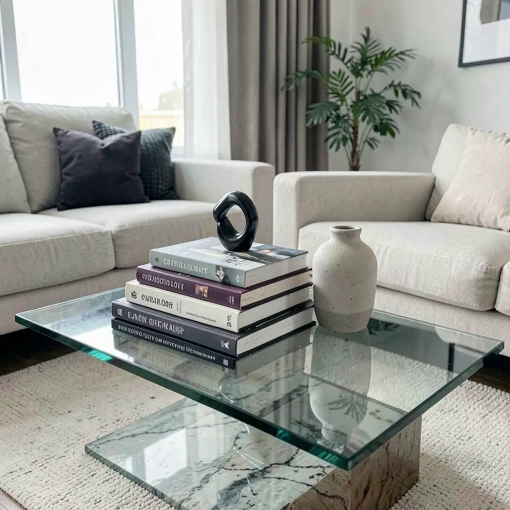 The styling trick? Create multiple small stacks rather than one tower. Glass tables show everything, including that precarious lean that happens with tall book stacks. Three piles of three books each looks better than one pile of nine.