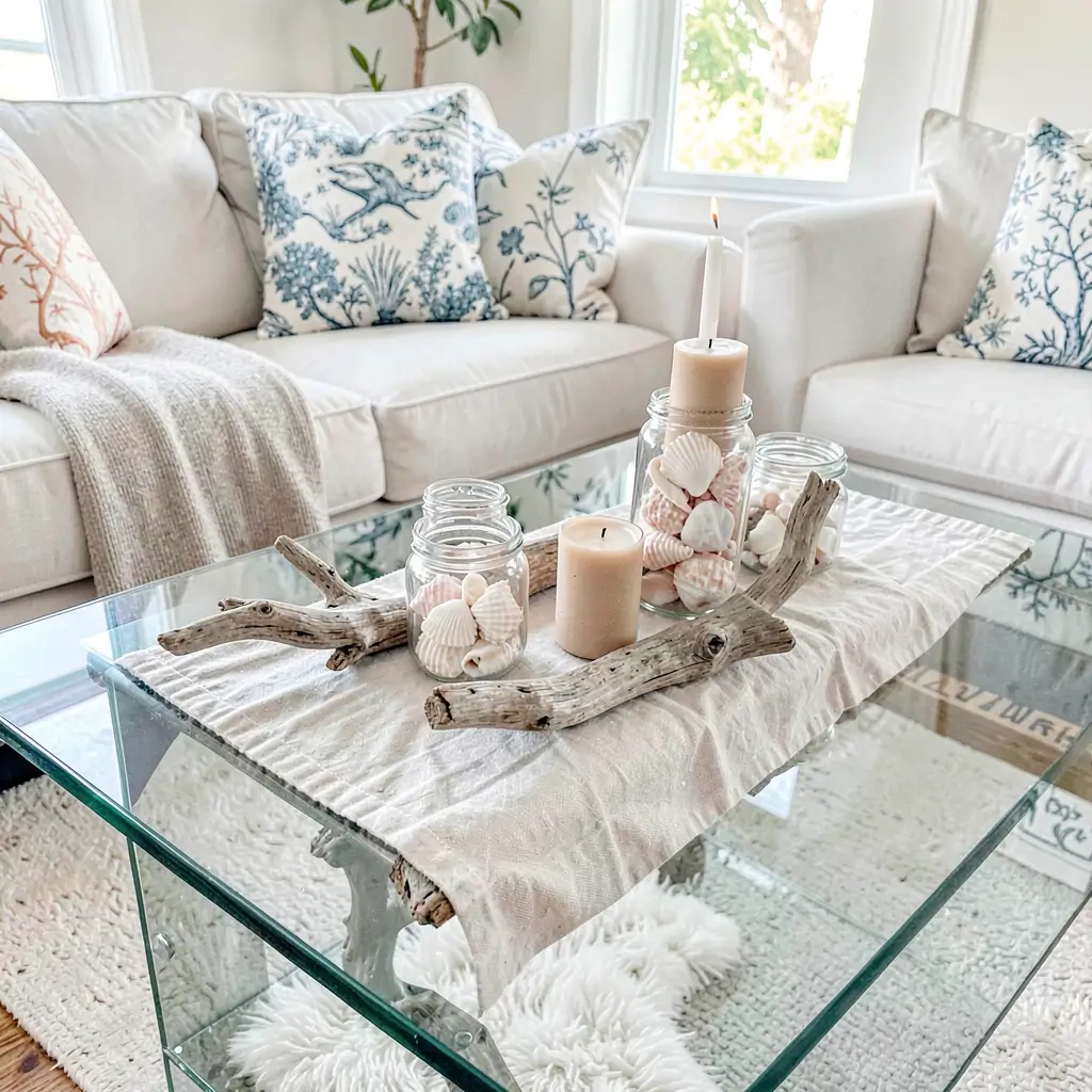 Glass tables and coastal decor are a match made in beach heaven. The transparency mimics water and air, while beach elements float like treasures washed ashore.
