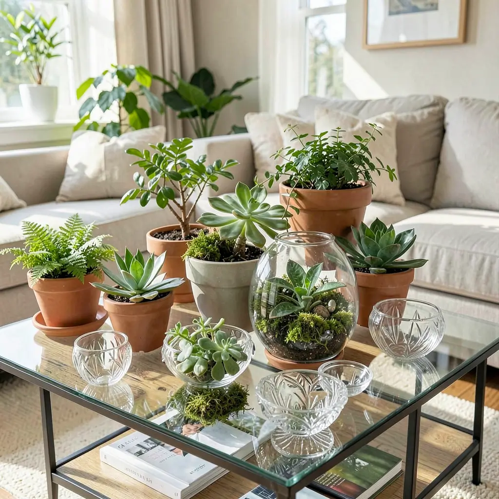 Plants on glass coffee tables create this incredible floating garden effect that makes your living room feel alive. The transparency lets you see stems and roots through clear vases, adding another dimension to your plant game.
