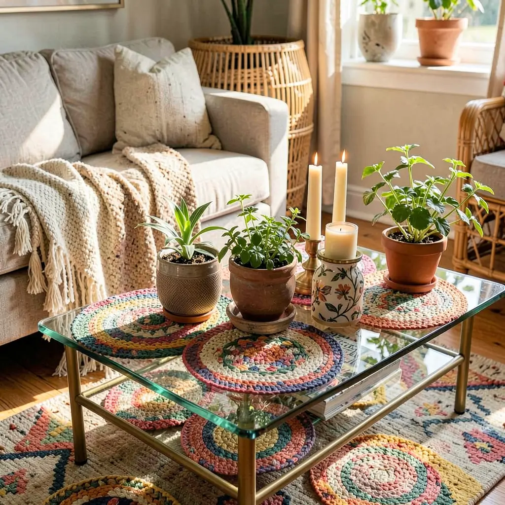 Boho style on glass tables creates this amazing floating garden effect that makes your living room feel like an enchanted greenhouse. Who knew transparency and textile chaos could be best friends?