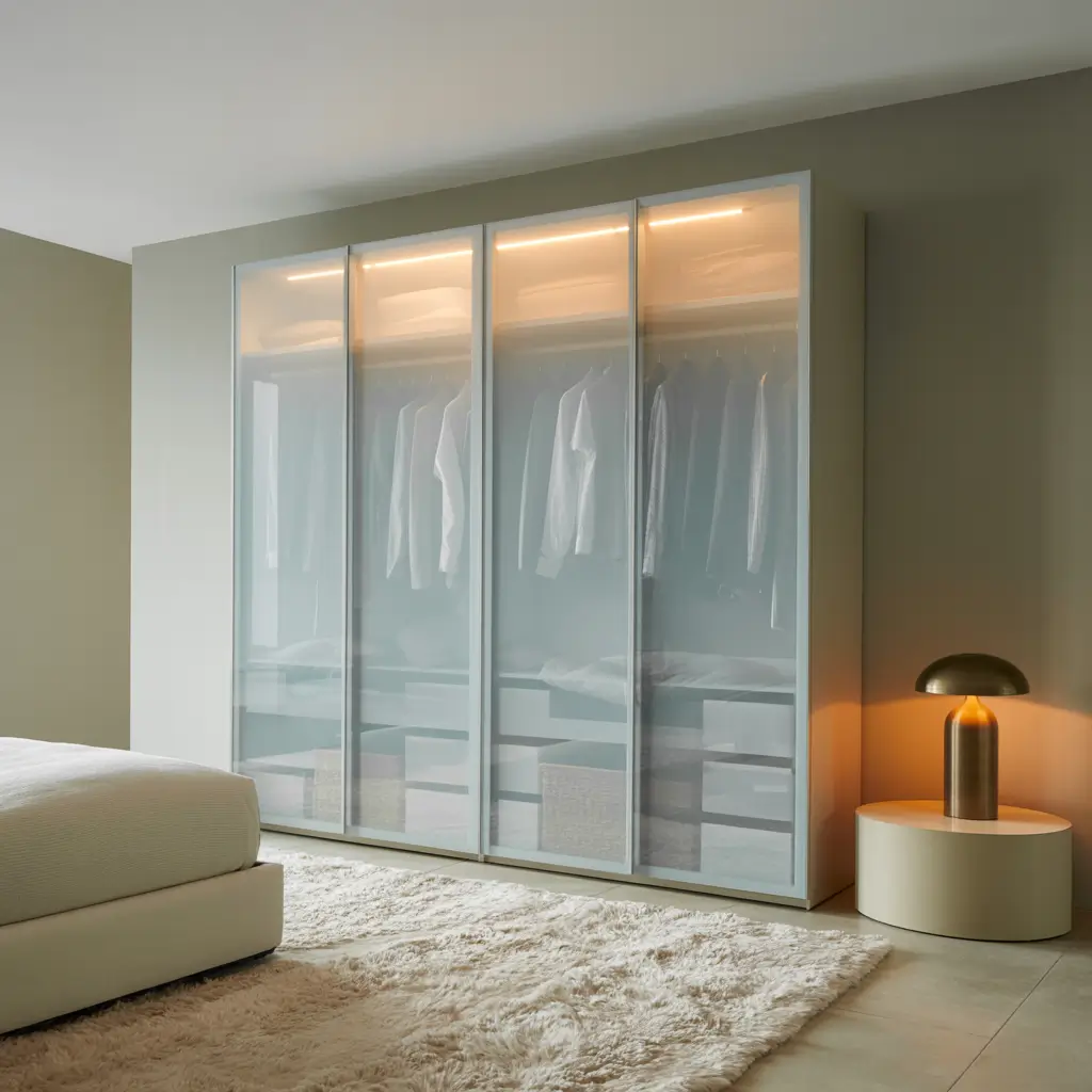 Frosted glass wardrobes give you the best of both worlds. You get that airy, light-enhancing quality of glass without putting everything on display. The diffused effect creates a soft, elegant look that honestly feels pretty luxurious.