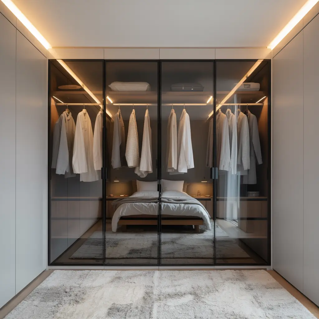 Glass panels create semi-transparent walls that define the walk-in space without completely closing it off from the bedroom. This maintains visual connection and light flow—your bedroom doesn’t lose a huge chunk of space to a dark, enclosed closet.