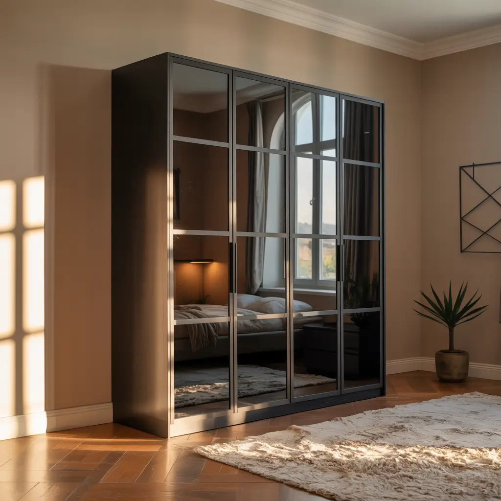 The best part? Black frames are incredibly forgiving. Smudges and fingerprints don’t show up nearly as much as they do on chrome or brushed nickel. This makes black-framed wardrobes more practical for everyday use—less maintenance, same stunning look.