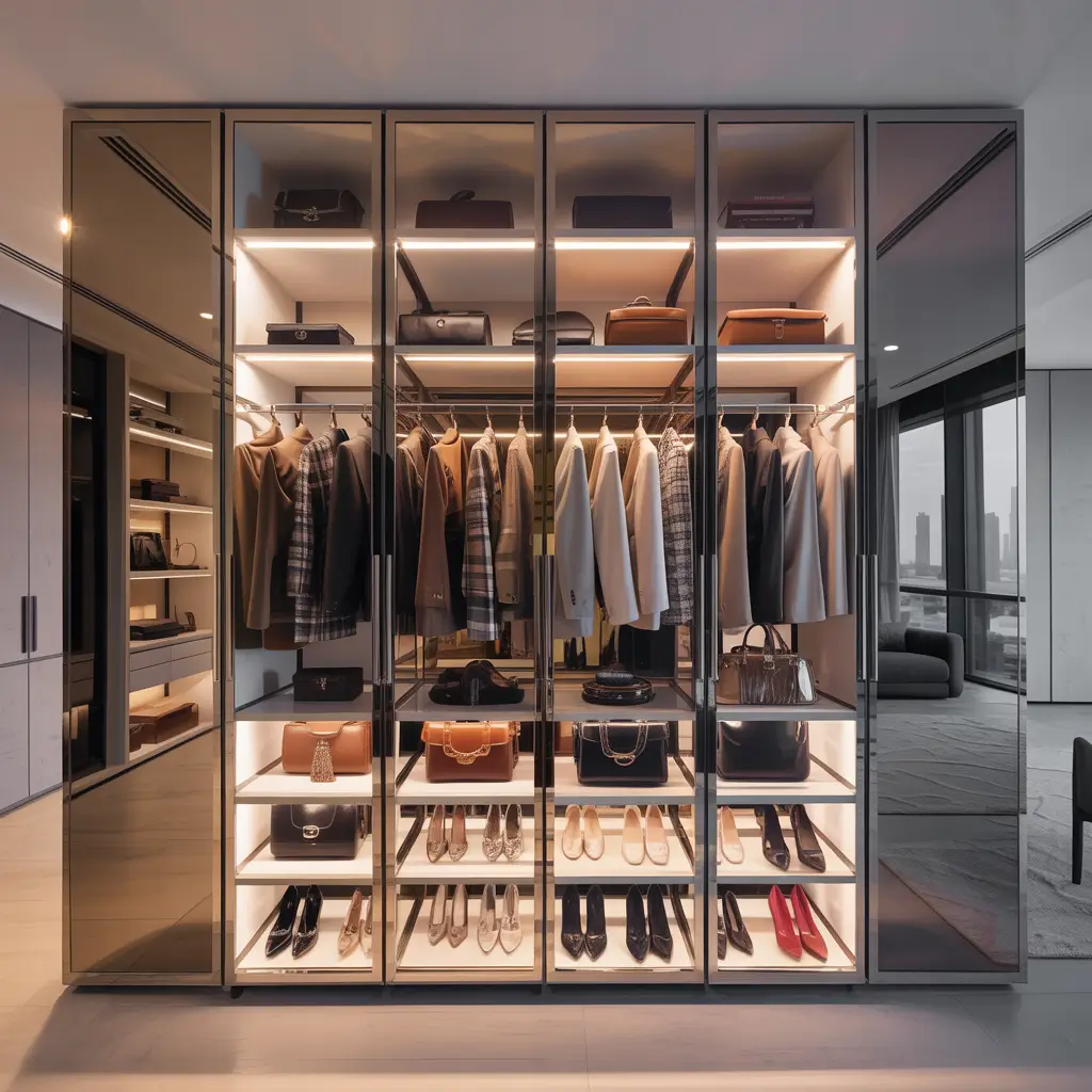 Minimalist Glass Wardrobe Designs with LED Lighting