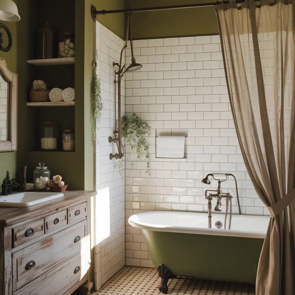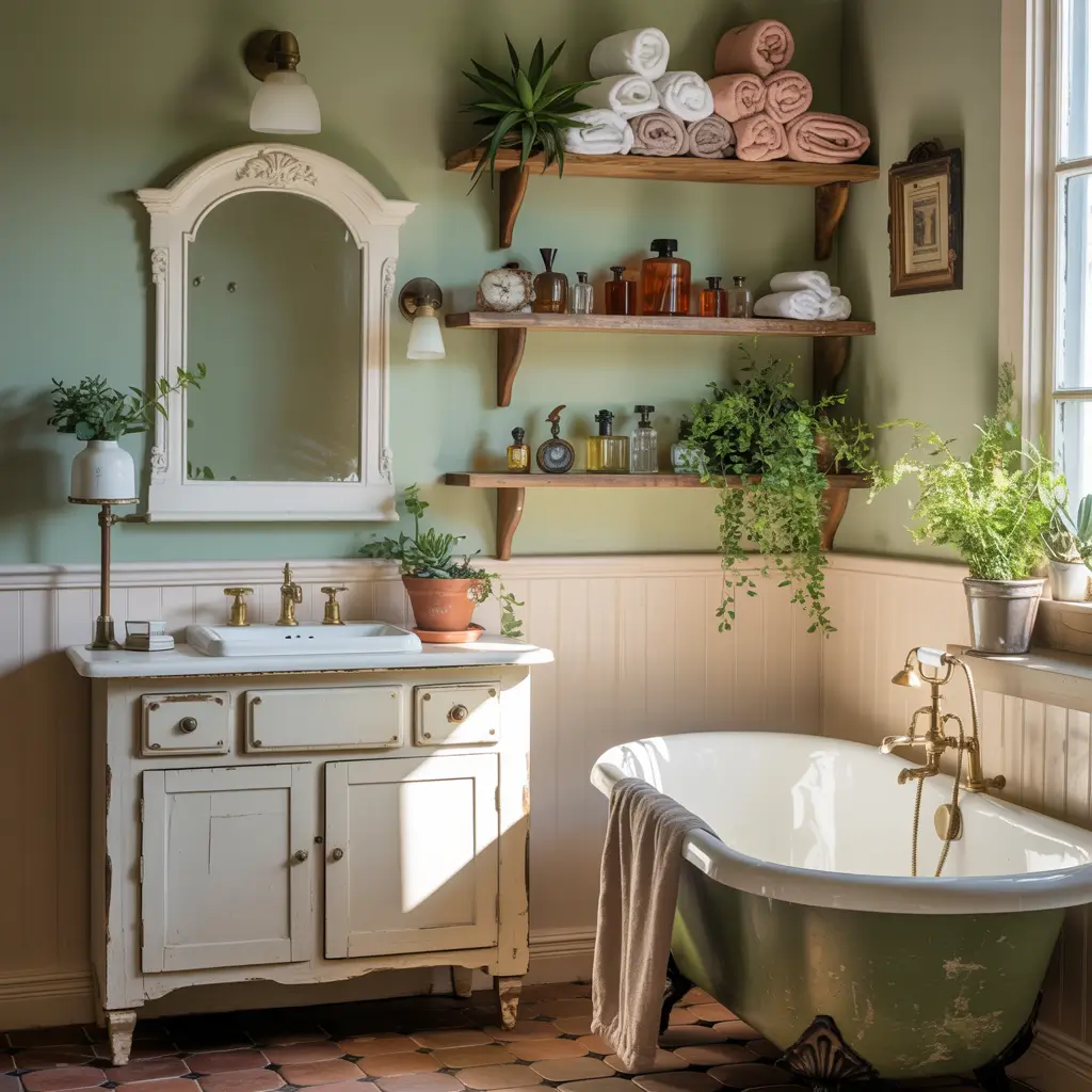 - Vintage-style green cabinet or repurposed furniture piece as vanity