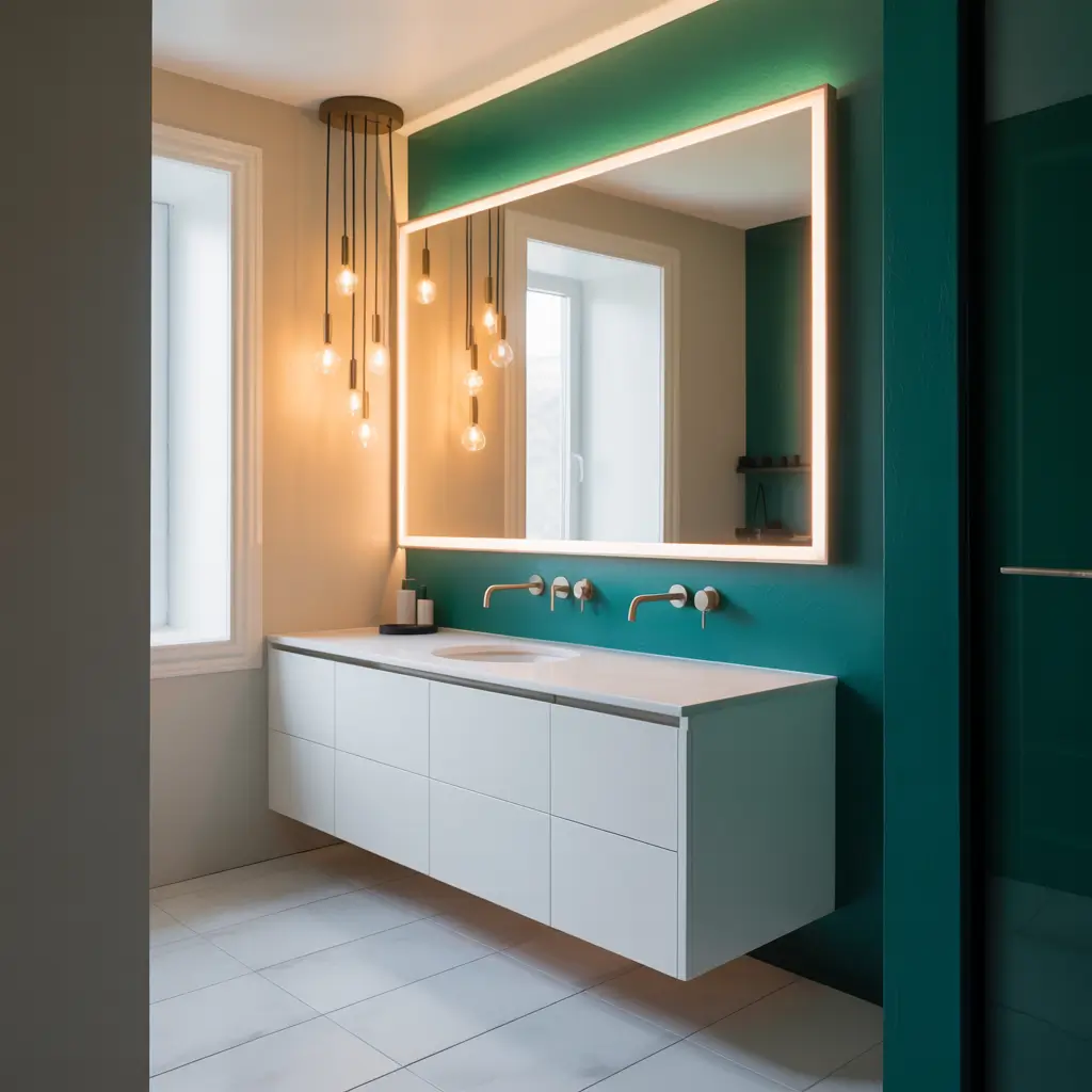 Start with white walls as your base – this creates that illusion of space we desperately need. Then introduce green through carefully selected elements rather than overwhelming the room. I’m talking about maybe a single green floating vanity or a sleek green-framed mirror.