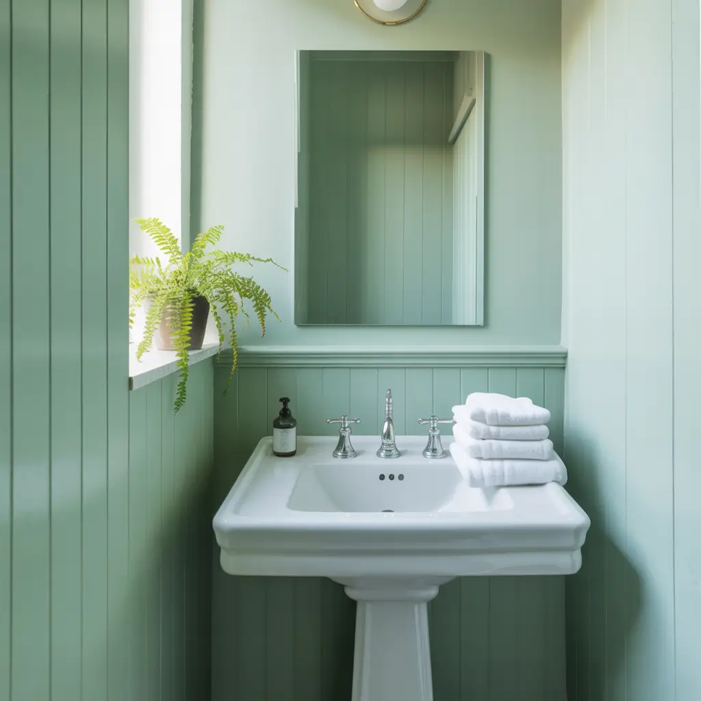- Pale green walls or tiles in muted, grayish tones