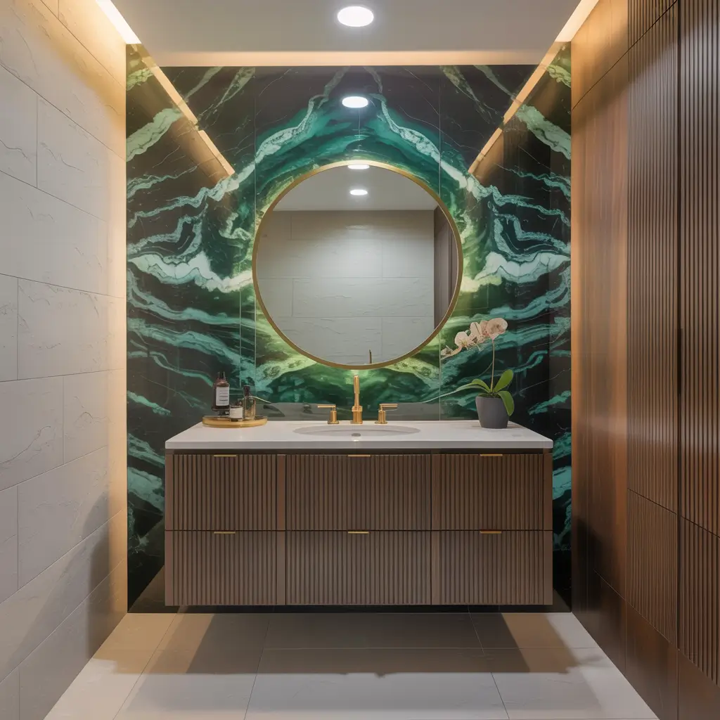 - Vanity countertops in green marble make a stunning focal point