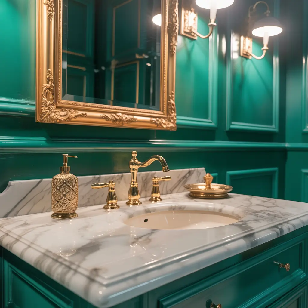 Want your bathroom to feel glamorous and fancy? The green and gold combination delivers serious luxury vibes that make every day feel like a special occasion.