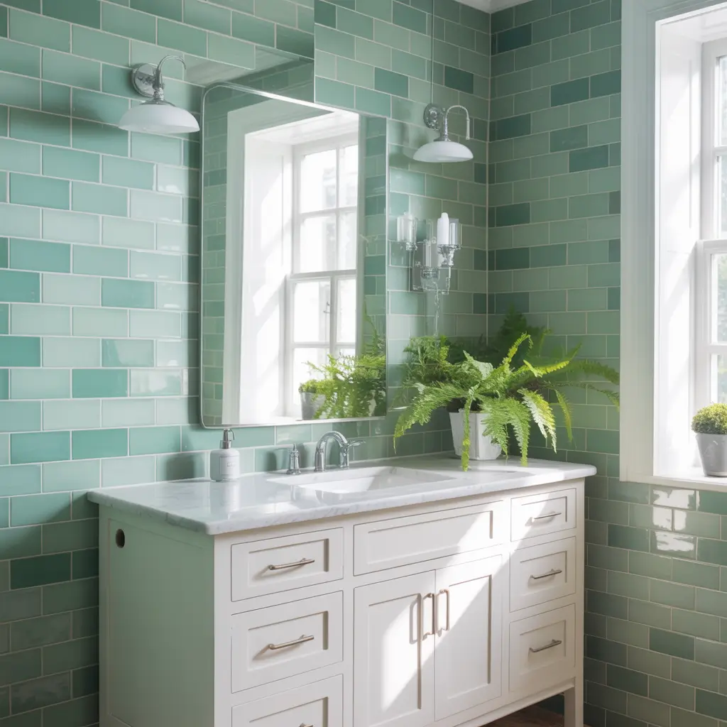 - Layer different shades of green—walls, tiles, accessories