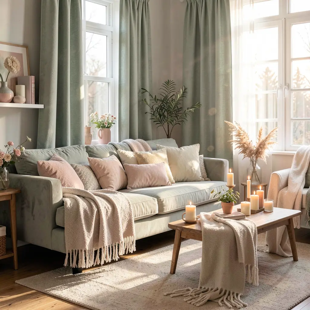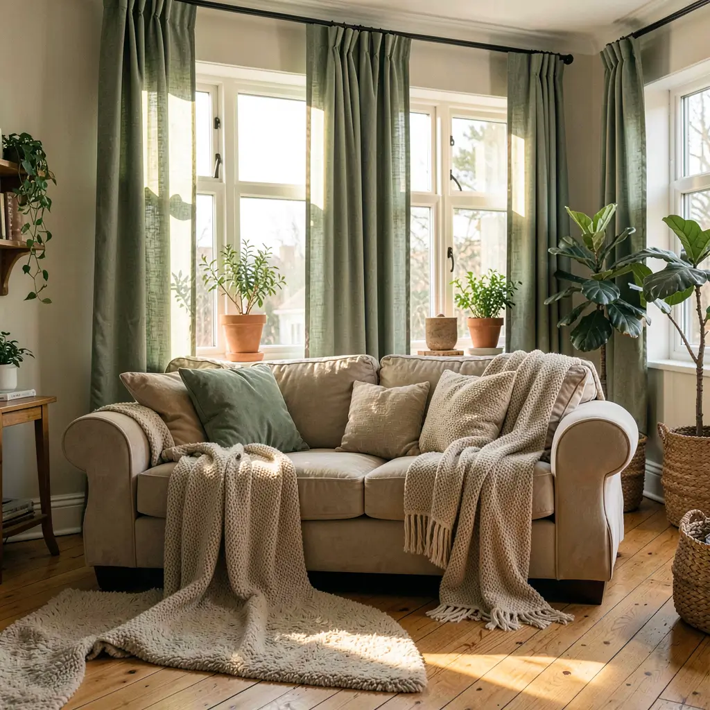 Texture amplifies the cozy factor exponentially. Velvet green curtains add instant warmth, while chunky linen in sage creates that lived-in luxury. I layer my forest green curtains with cream sheers underneath, creating depth that makes my 600-square-foot living room feel like a multi-dimensional cozy cave rather than a shoebox.
