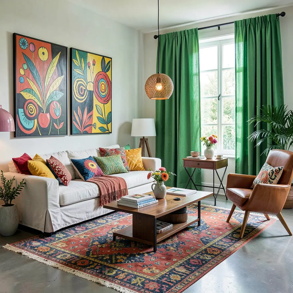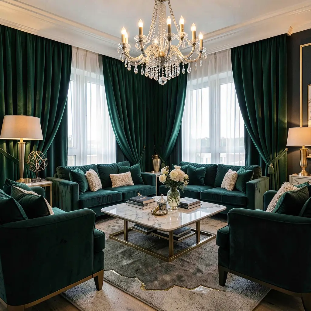 Luxurious green curtains make your living room feel like that hotel you couldn’t quite afford but booked anyway. I achieved this with emerald silk curtains that cost less than one night at said hotel but deliver that same “I’ve made it” feeling daily.