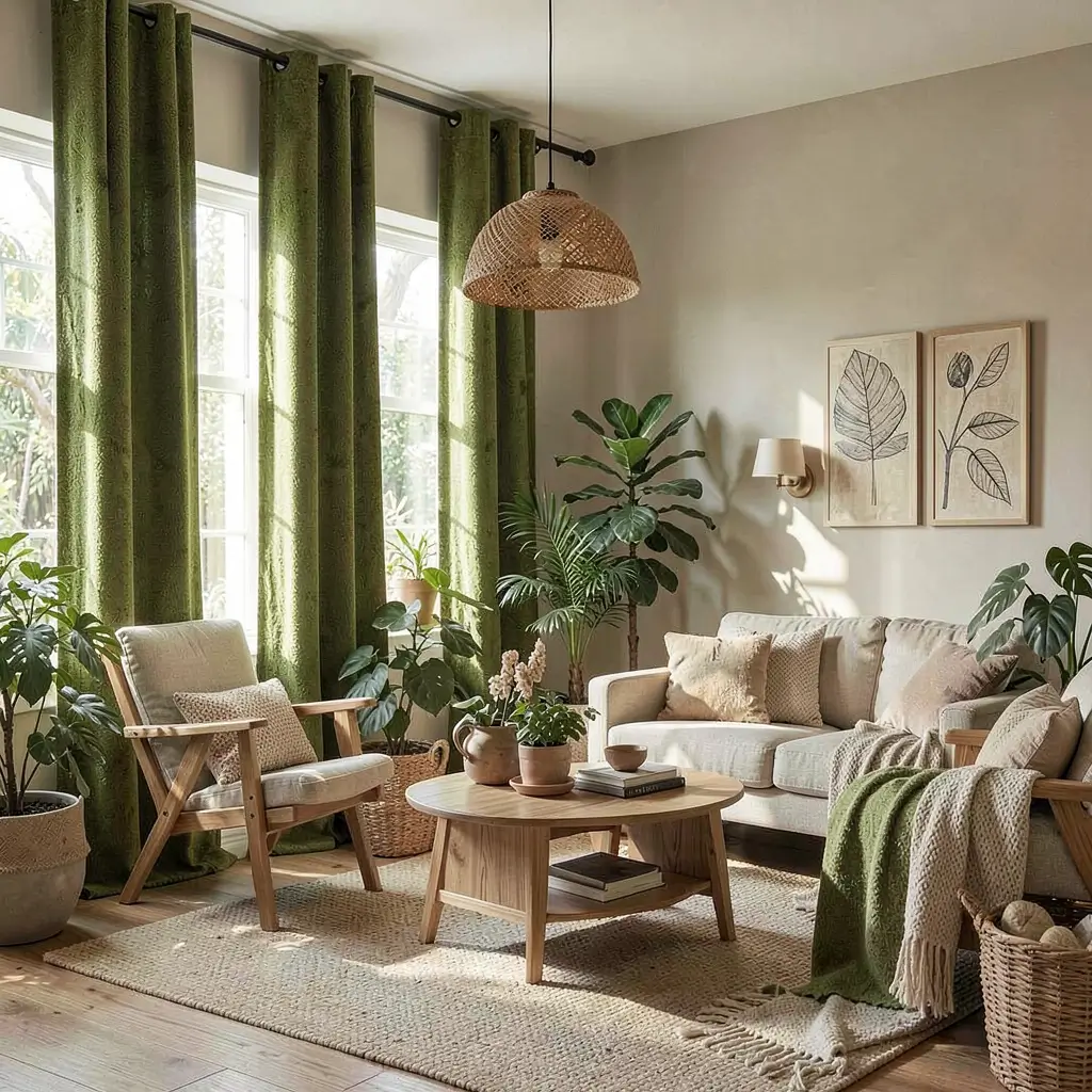 Nature-Inspired Green Curtains Living Room Ideas
