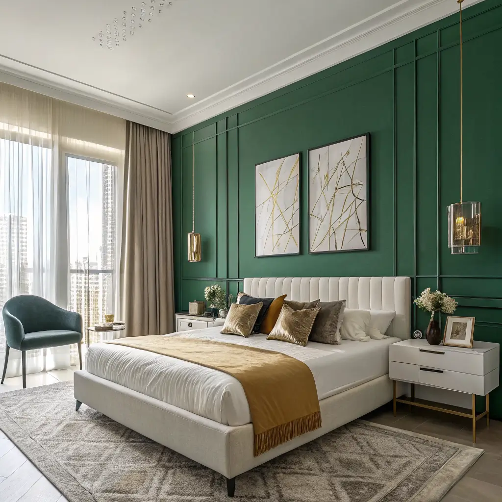 Want your master bedroom to feel like a boutique hotel suite? Jade green paired with gold accents delivers that high-end, luxurious atmosphere without requiring a six-figure renovation budget. This combo is timeless, elegant, and surprisingly easy to pull off.