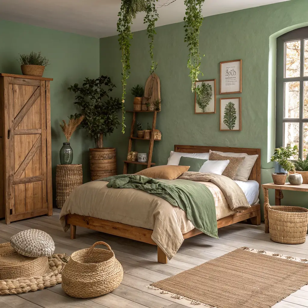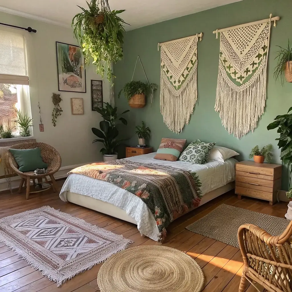 Boho style thrives on mixing textures, patterns, and organic elements. Green plays a starring role here, not just on the walls but through actual living greenery scattered throughout the room. The result feels lush, layered, and effortlessly cool.