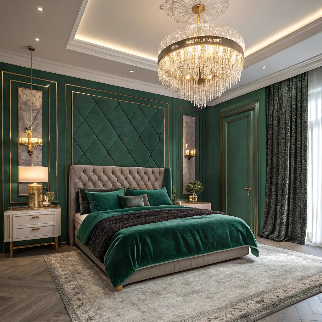 - Jade green velvet bedding or headboard — velvet adds tactile luxury that elevates the entire room