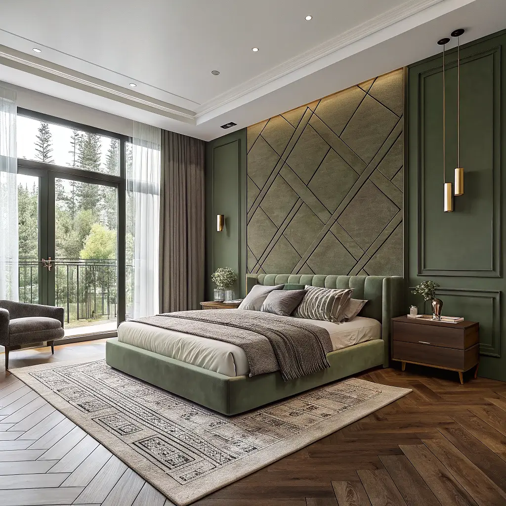 Olive green doesn’t always get the spotlight, but it absolutely should. This warm, earthy tone brings a modern sophistication to master bedrooms that cooler greens simply can’t match. When you combine olive green with rich textures, you create a space that feels contemporary, cozy, and deeply grounded.
