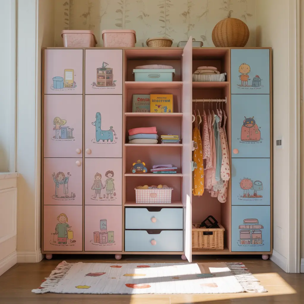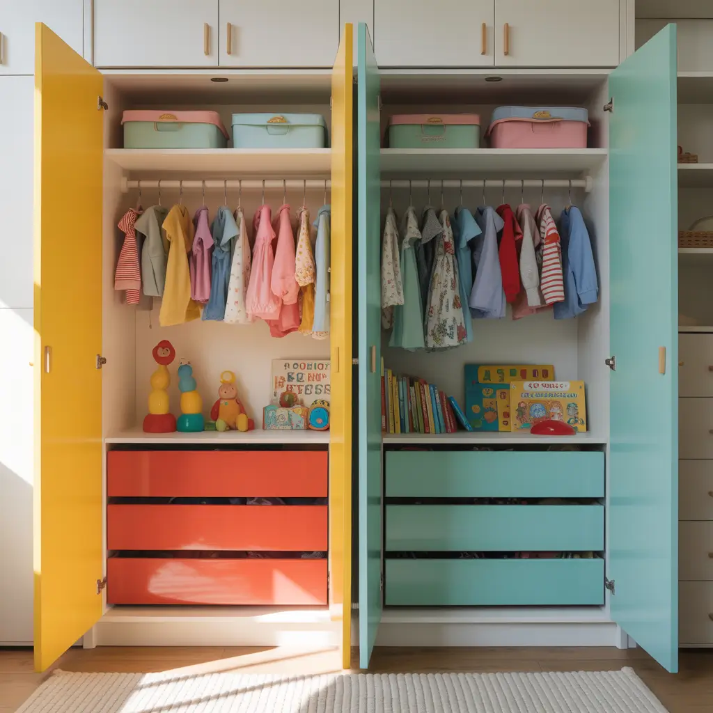 Here’s a controversial opinion: not everything needs to be hidden behind closed doors. Wardrobes with open cubby sections combined with toy storage teach kids organization while keeping favorite items accessible.
