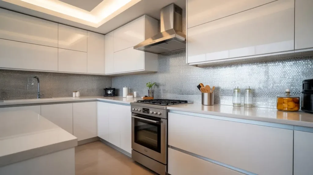 Mirrored or metallic glass tiles create glamorous, light-bouncing magic. Gold, silver, bronze, or champagne metallics add luxury without being tacky (as long as you don’t overdo it). These work especially well in small kitchens where you want to maximize light.
