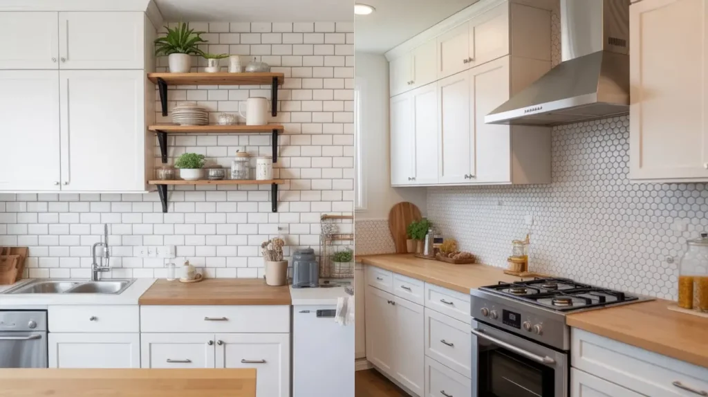 Subway tile is rectangular, typically 3×6 inches, and completely ubiquitous. Hexagon tile is six-sided, available in various sizes, and having a major moment right now. Both work beautifully with white cabinets, but they create very different vibes.