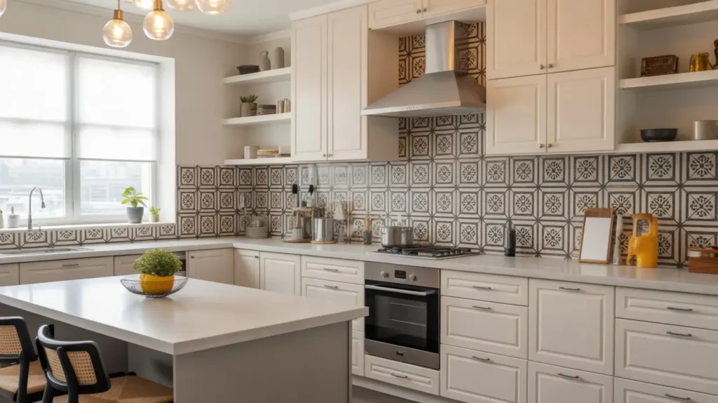 Encaustic cement tiles with geometric patterns are another gorgeous option. These have the pattern embedded in the tile rather than printed on top, so they age beautifully. The designs range from subtle to bold, and they bring serious European cafe vibes to your kitchen.