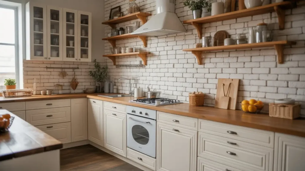 White cabinets are basically mandatory in farmhouse kitchens, so your backsplash options lean heavily into rustic materials and classic patterns. Brick veneer or brick-look tiles create that reclaimed, farmhouse feel without the structural issues of actual exposed brick.