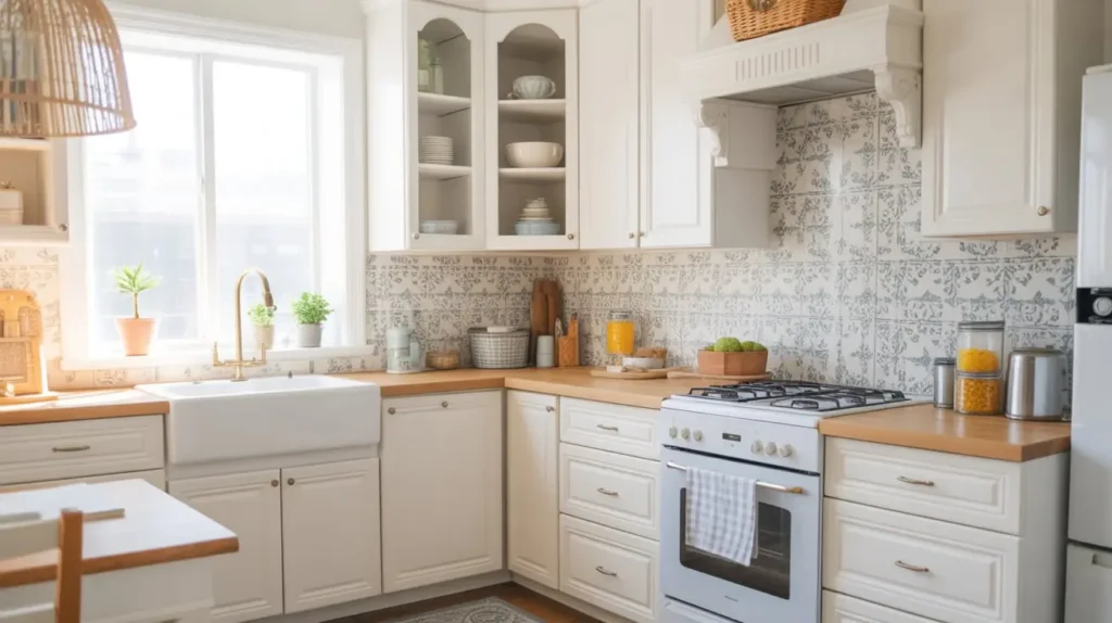 Geometric patterns add instant personality to white cabinets without requiring bold colors. You can go with classic shapes like hexagons, triangles, or diamonds, or get fancy with Moroccan-inspired patterns like quatrefoil or arabesque.