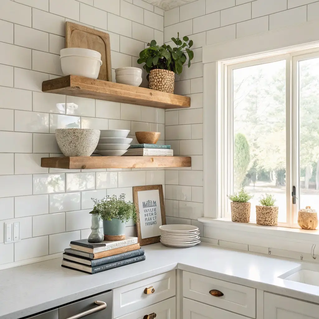 Floating shelves pull double duty. They act as storage and decoration simultaneously, which makes them perfect for kitchens where counter space is a precious commodity. You can stash your everyday spices, cooking oils, and coffee mugs on them while still making the whole setup look intentional and curated.