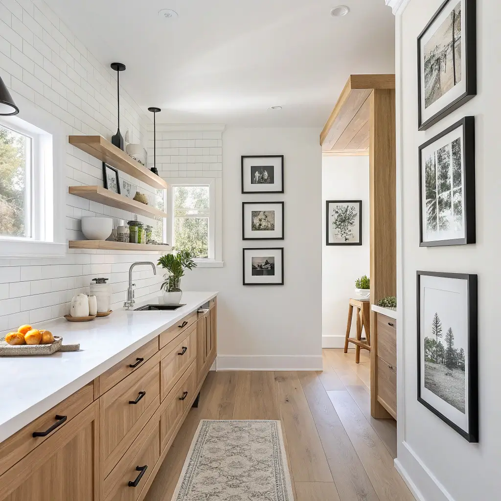 gallery wall might sound like it belongs in a living room, but a carefully curated black and white version works beautifully as kitchen wall decor. It adds sophistication without overwhelming the space, and the monochrome palette keeps things from looking too busy in an already visually complex room.